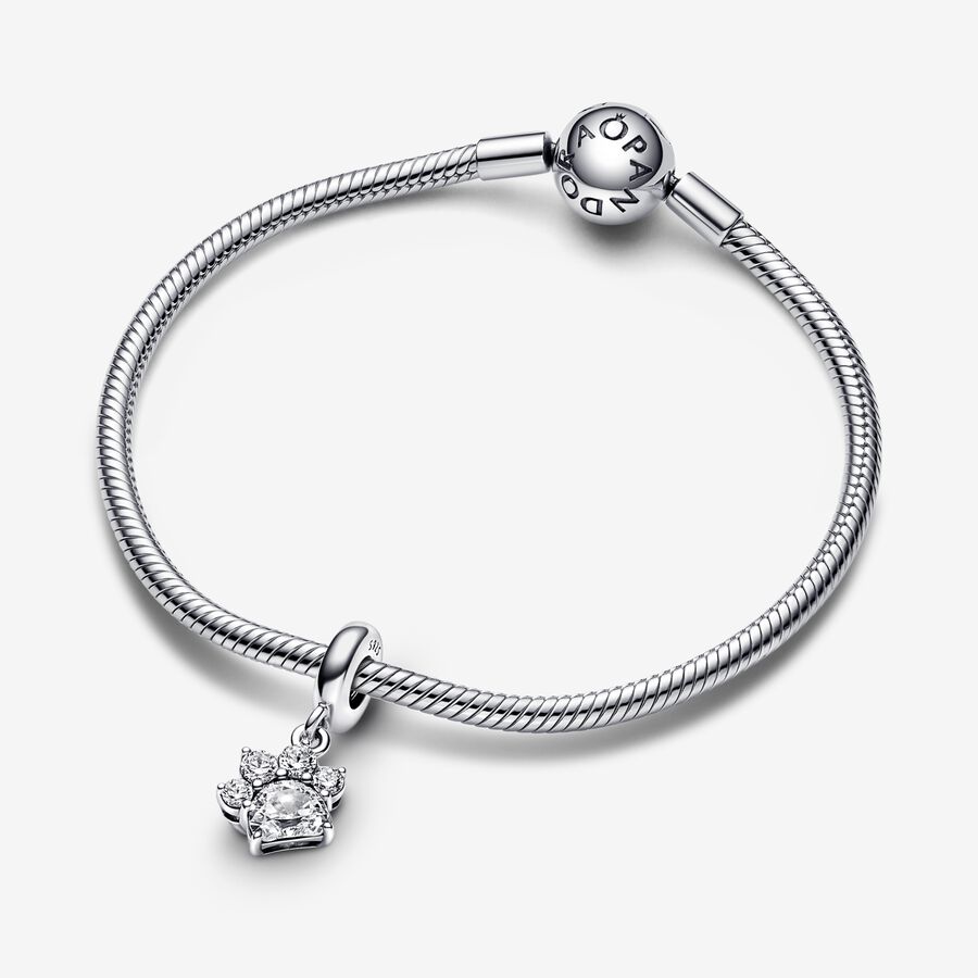 Elevate your love for your best friend with the Sparkling Pet Paw Print Dangle Charm. Cast in sterling silver, it features four sparkling stones as the toes and a specially crafted center stone that makes up the paw pad. The back of the charm is inscribed with the words: “Pawprints on my heart.” Carry this charm as a reminder of how much your furry companion enriches your life.