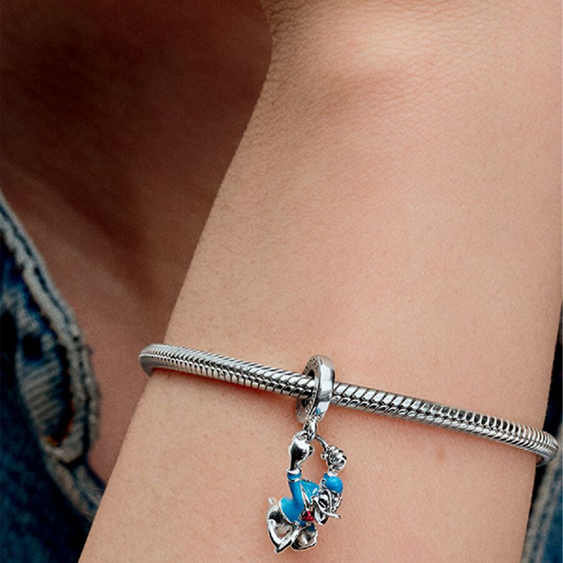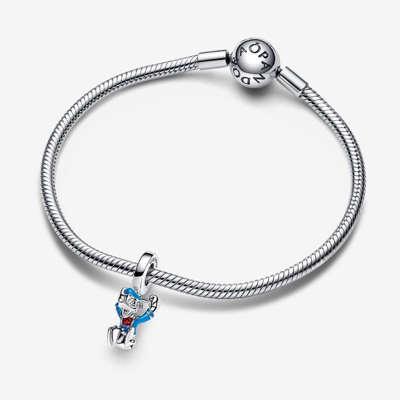 Channel a classic character with the Disney Donald Duck Dangle Charm. This sterling silver design depicts Disney's Donald Duck mid-jump with raised arms, closed eyes and an open bill. His nautical shirt and hat feature blue and red enamel details. Famous for his fiery temper, strong opinions and mischievous hijinks, Donald Duck is an iconic character in the Disney universe, making this charm a perfect addition to any fan's collection.