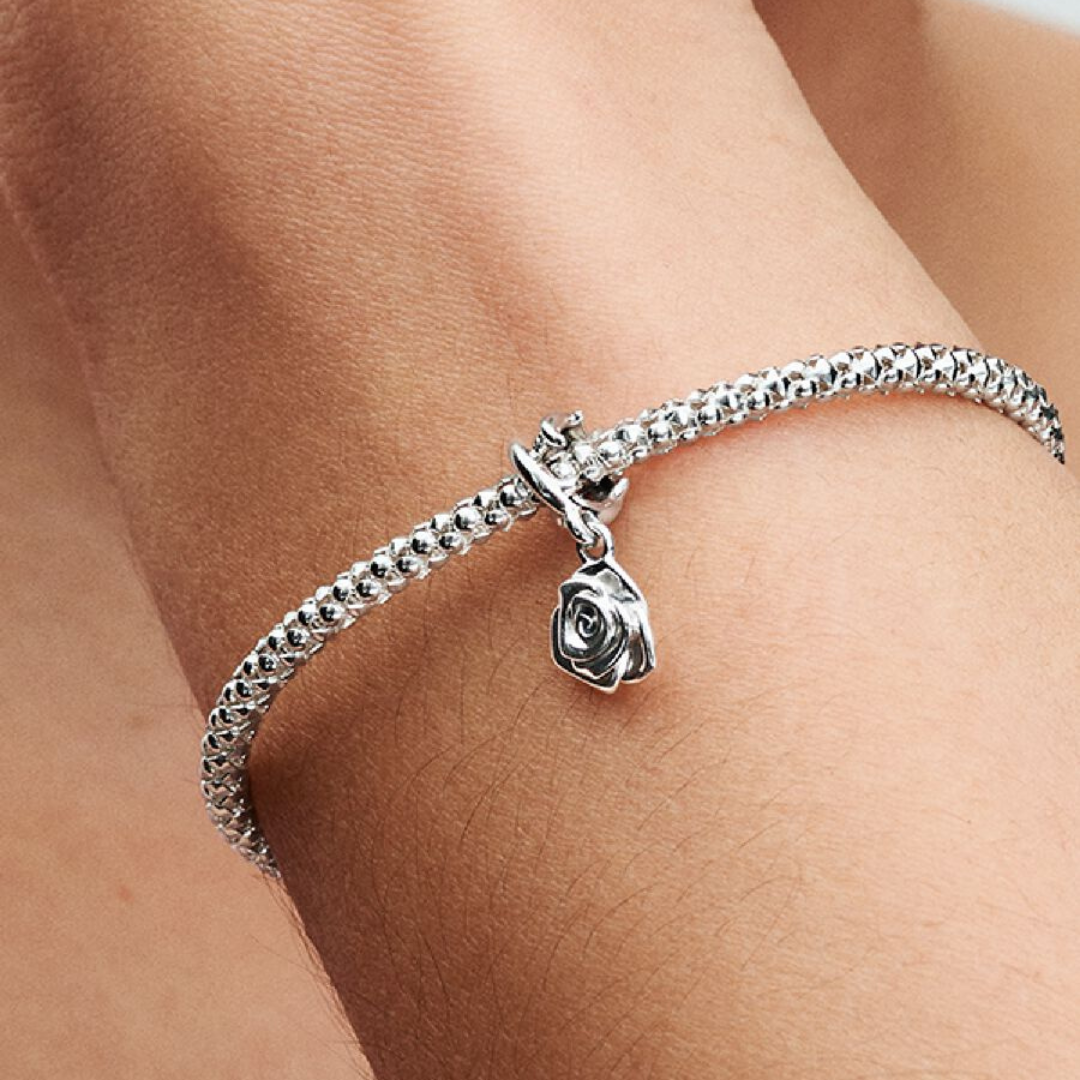 Embrace the symbolism of flowers with the Rose in Bloom Dangle Charm from Pandora Moments. Crafted in sterling silver, this charm showcases a delicate, three-dimensional rose with layered petals that evoke the essence of blooming love. The polished convex back adds a touch of sophistication, while the sterling silver bail, fashioned as the rose's stem with raised thorns, adds a touch of realism. A symbol of timeless love, this charm captures the classic gesture of gifting a rose with a unique Pandora twist.