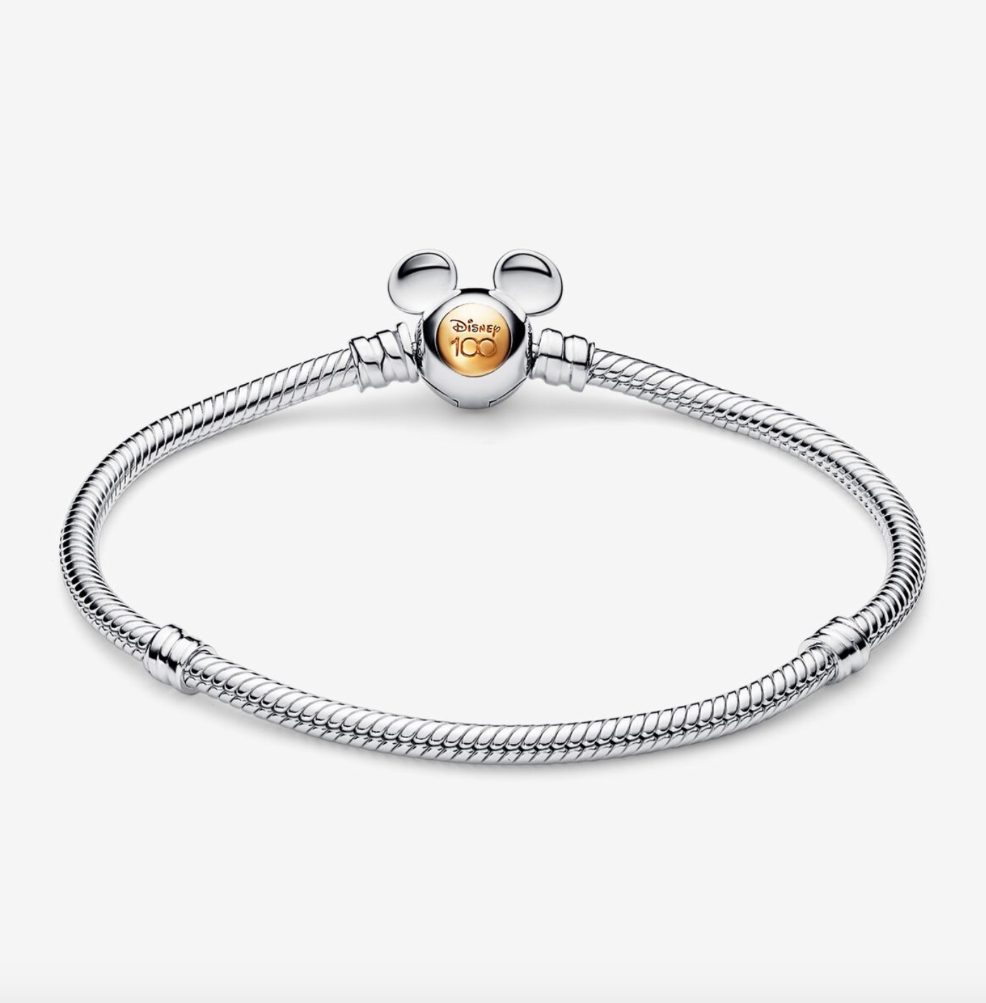 Make precious memories last forever with our Disney 100th Anniversary Moments Snake Chain Bracelet. Hand-finished in sterling silver, this limited edition collector’s piece features a Mickey Mouse-shaped clasp with a 14k gold circle engraved with “Disney 100”. Style it with your favorite Disney x Pandora charms to celebrate 100 years of wonder.