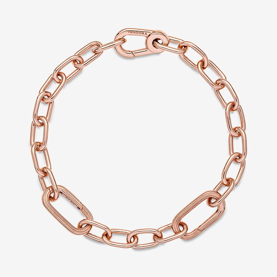Link what you love like never before. Our 14k rose gold-plated Pandora ME Link Chain Bracelet holds endless styling possibilities. The design features two openable connectors – designed with grooved surfaces to set them apart – a group of four links between each styling connector and a carabiner clasp closure. First customise your link chain: four links can be swapped out for one styling double link or one styling link – keep the original length or adjust it to suit you. Once you’ve curated your link chain, style up to one medallion per link, two meaningful medallions or up to eight mini dangles on each openable connector to show the world who you are. Please note this item is only compatible with Pandora ME jewelry and will not fit our other collections.Discover how to mix and re-mix your Pandora ME look .