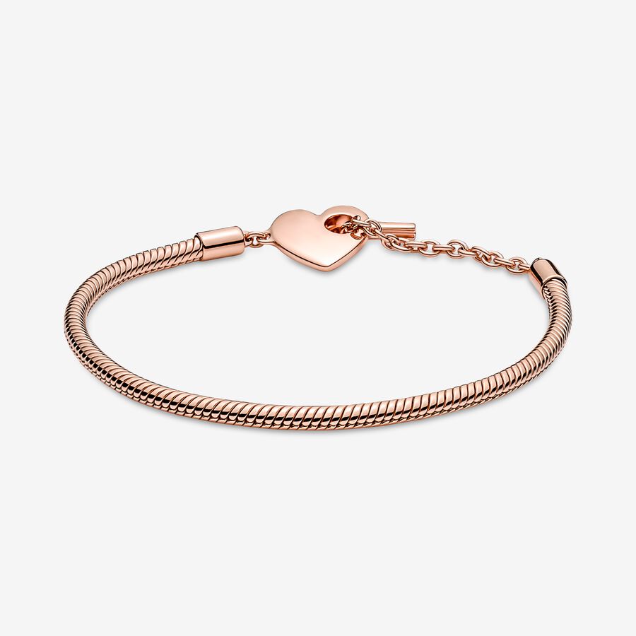 Add a warm-toned accent to your look with the Pandora Moments Heart T-Bar Snake Chain Bracelet. Hand-finished in our 14k rose gold-plated unique metal blend, this piece is an updated take on the Pandora Moments snake chain bracelet. Featuring a heart-shaped T-bar double circle closure, loop the T-bar through the smallest circle to guarantee that the bracelet clasp is securely closed. Wear this sleek, modern style with up to 10-13 Pandora Moments charms and dangles.