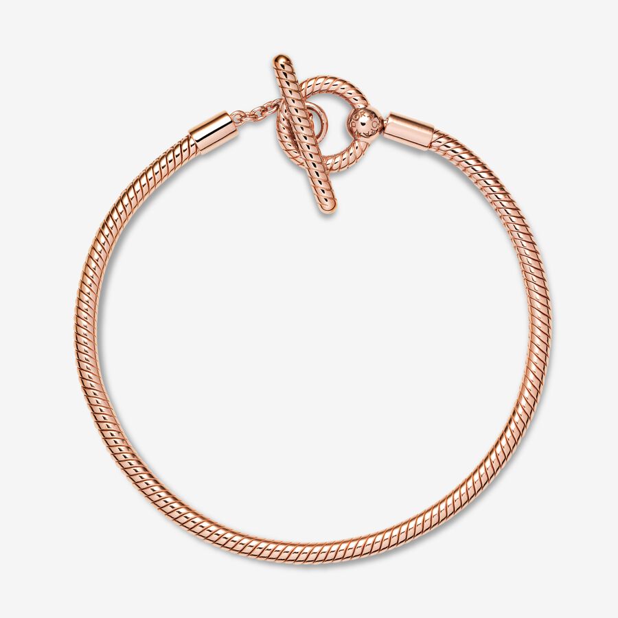 Expand your collection with the Pandora Moments T-Bar Snake Chain Bracelet. Hand-finished in 14k rose gold plating, this piece is an updated take on the Pandora Moments snake chain bracelet. Featuring a T-bar double circle closure, loop the T-bar through the smallest circle to guarantee that the bracelet clasp is securely closed. Including a snake chain pattern on the rigid parts of the bracelet, wear this piece with up to 15-20 Pandora Moments charms and dangles.