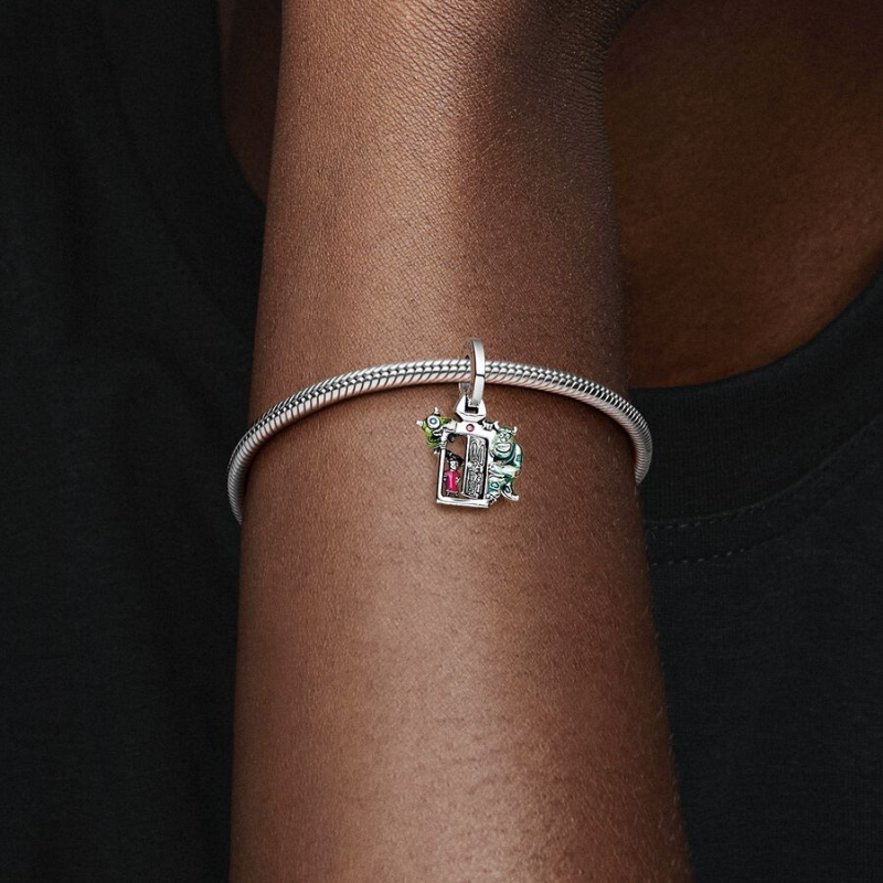 Open the door to friendship with the Disney Pixar Monsters, Inc. Door Dangle Charm. This sterling silver dangle charm features Pixar's lovable monsters Mike and Sulley hanging onto a door that opens to reveal little Boo. This dangle charm also features colorful hand-applied enamel, which brings each character to life. Wear it as a reminder of the friends who make you scream with laughter and who always have your back (be it spiky, furry or anything, really). After all, whether monster or human, there’s nothing more powerful than friendship and laughter!