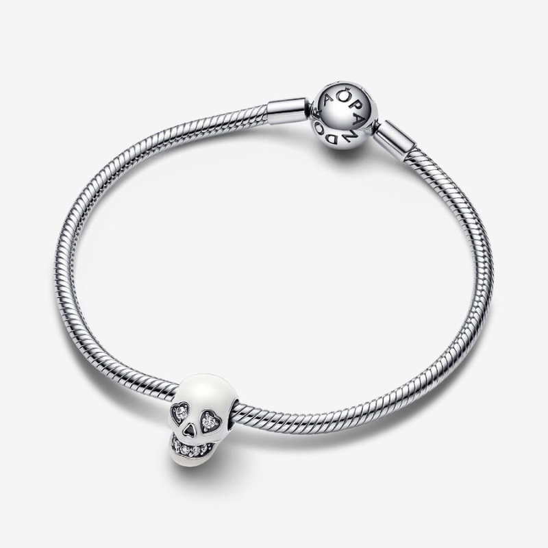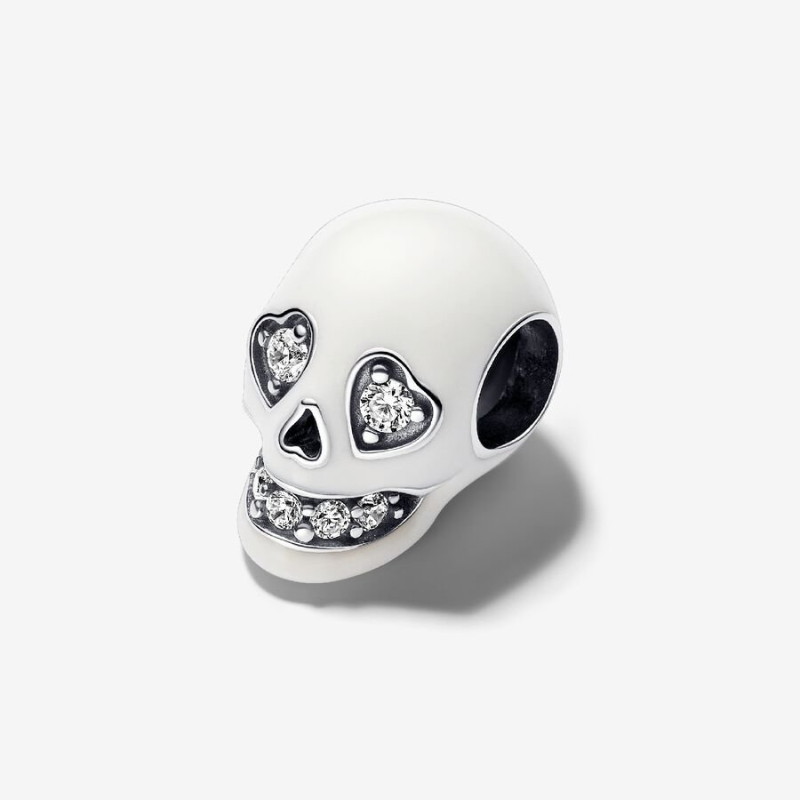 Add some edge to your look when you wear the Glow-in-the-dark Sparkling Skull Charm. This sterling silver charm features a skull covered in glow-in-the-dark enamel with a mouth and heart-shaped eyes sparkling with clear cubic zirconia stones. Cut-out details adorn the sides of the mouth, the nose and the bottom of the skull. Pay homage to the mystery of the afterlife and add an irreverent – not to mention glowing – touch to your style with this skull pendant.
