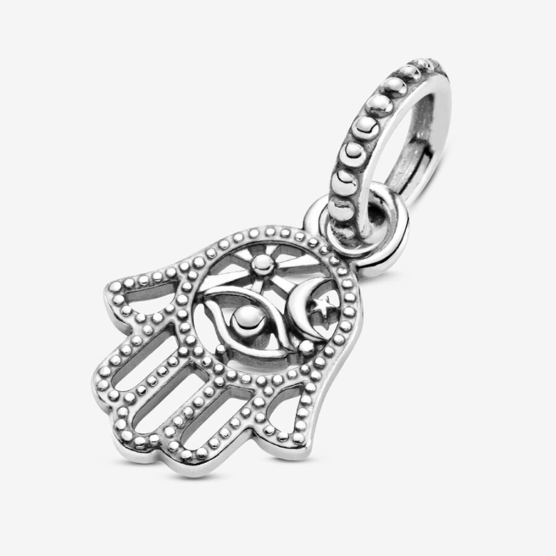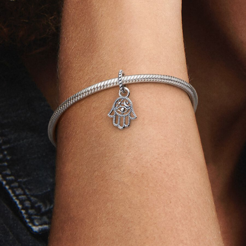 Always channel positive vibes with the Protective Hamsa Hand Dangle Charm. Hand-finished in sterling silver, this Hamsa charm features an intricate openwork design and hangs from a beaded bail. An eye, rays and crescent moon motifs feature inside the hand, which includes beading along its outline as a reference to signature Pandora design. A talisman to defend against evil, the dangling hand is seen as a gesture of welcoming an abundance of goodness, kindness, friendship and grace into your life.
