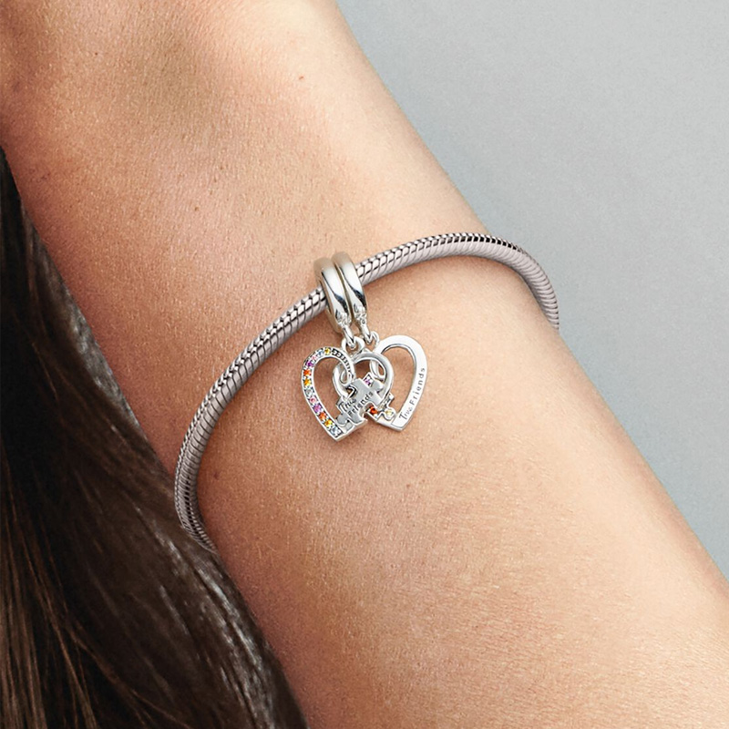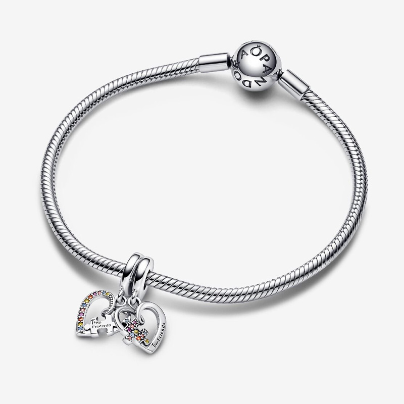 Crafted in sterling silver, the Puzzle Piece Hearts Splittable Friendship Dangle Charm serves as a reminder that friends complete us. Designed for sharing, it features two dangles that combine a cutout heart with a puzzle piece - both are decorated on one side by an array of colorful stones. The bail is engraved with a message: "My Missing Piece." Give one to your bestie and join the pieces whenever you’re together to connect in a whole new way.