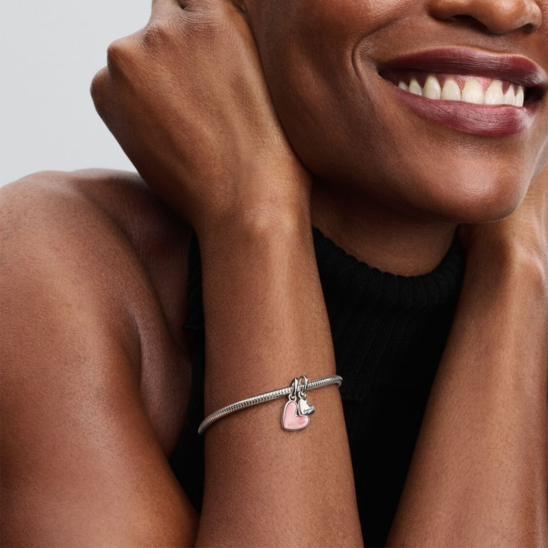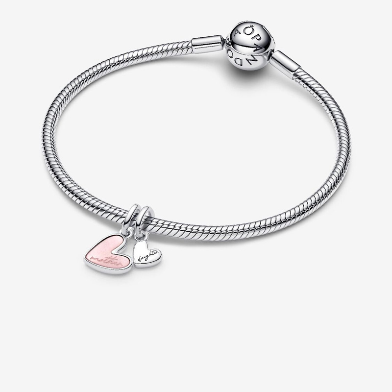 Bring a special bond to life with the Splittable Mother & Daughter Dangle Charm. Designed to be shared, this sterling silver charm features two hearts –a small one and a larger one covered in pink man-made mother-of-pearl. The large heart says "Mother" on one side and "I would choose you in every lifetime" on the other side; the small heart says "Daughter" on one side. Inspired by motherhood in its many expressions, this splittable charm celebrates the mother-daughter connection.