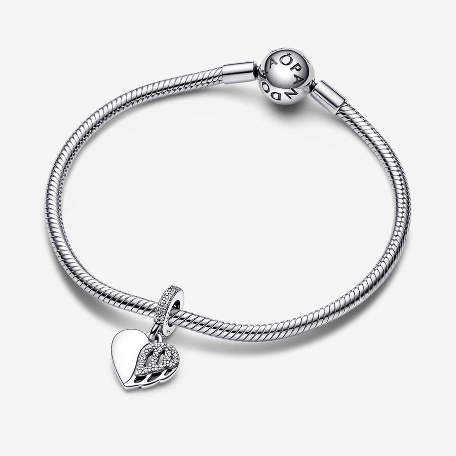 This special charm commemorates a love that is eternal, even when our dear ones are no longer with us. The Heart & Angel Dangle Charm is crafted from sterling silver and features a heart shape with a cut-out angel wing motif on one half of the heart, with the upper part of the wing slightly raised and decorated with pavé. The other half of the heart bears the engraved message “You left my world but never my ❤”. The bail features two rows of pavé on its outer side. A meaningful piece to wear as a reminder of the ones you’ll always carry in your heart.