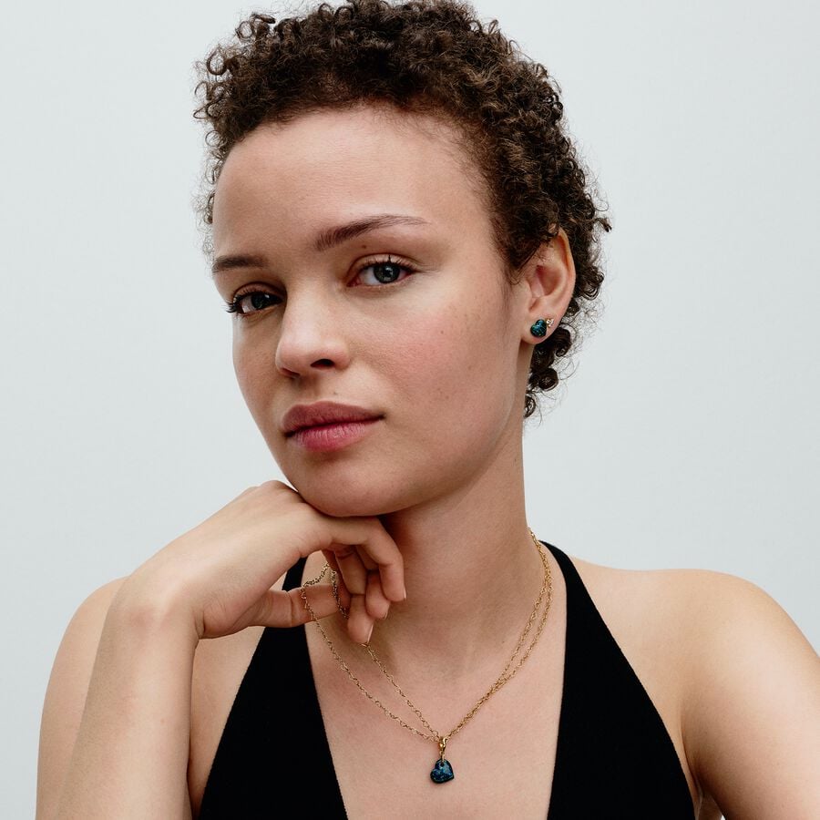 Channel the heart of the jungle with the Opalescent Green Heart Dangle Charm. A lab-created, heart-shaped iridescent opal features a spectrum of colors and streaks of glitter designed to evoke the vivid colors of the tropics. The heart hangs from an angle from a 14k gold-plated jump ring and pear-shaped bail. Pair this vibrant charm with other warm-toned styles to create a rich focal point and remind yourself of the wild, free-spirited energy of nature and summer.