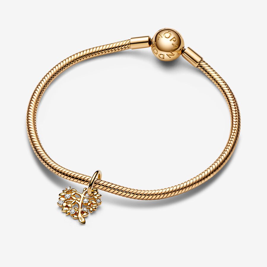 Embrace your love for your family with this elegant and symbolic charm. The Sparkling Heart & Family Tree Dangle Charm is crafted from solid 14k gold, forming a heart-shaped family tree motif set with sparkling cubic zirconia stones adorning its branches and leaves. With deep roots and sheltering branches, the family tree is a powerful symbol of deep love for your family and community.