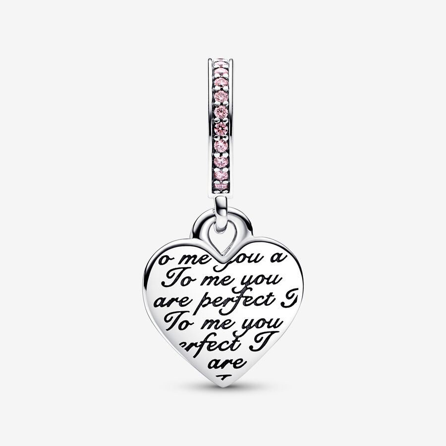 A jewelry gift for a mom who will always be perfect to you, just as she is. The Two-tone Infinity Heart Double Dangle Charm features an openwork heart dangle in 14k rose gold plating forming an infinity symbol in the center, adorned with a row of pink pavé and engraved with the word “Mom” with a pink stone as the central letter. Behind it is a sterling silver heart-shaped disc engraved with the message “To me you are perfect” creating a repeating pattern on both sides. Pink pavé on the bail adds a finishing touch. A celebration of motherly love in all its forms.