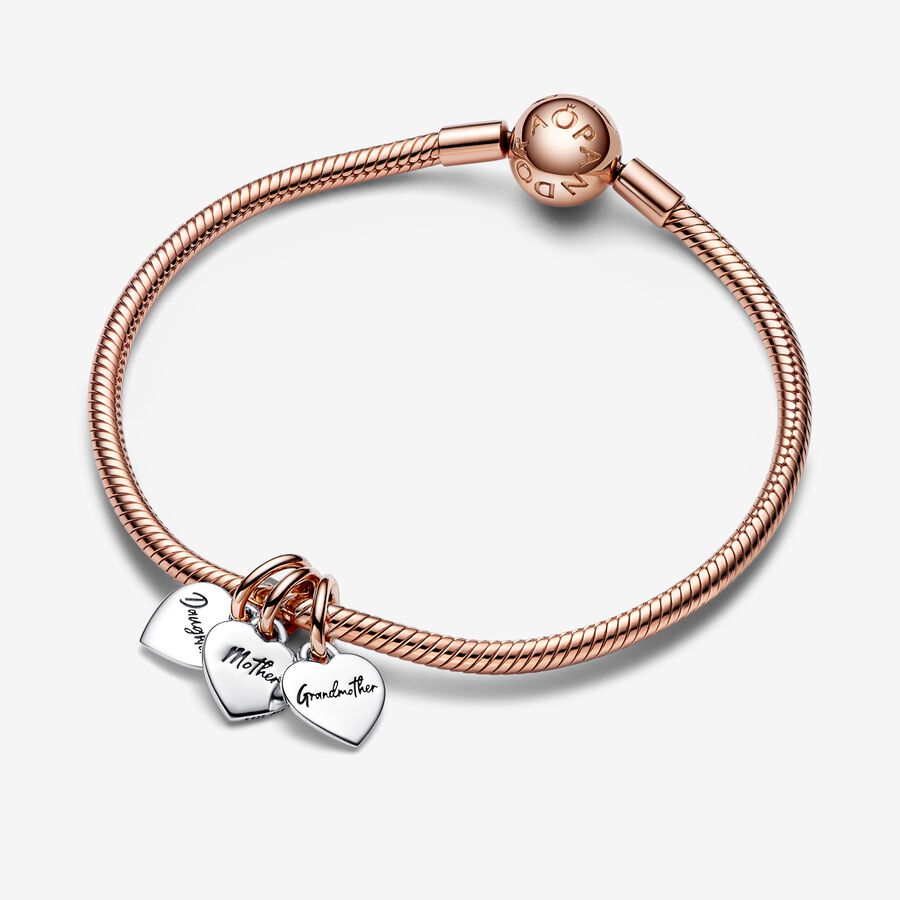 Celebrate generations of love with the Two-tone Splittable Family Generation of Hearts Triple Dangle Charm. This charm is made up of three individual heart charms, crafted from sterling silver with 14 rose gold-plated bails. Each one is engraved with a different family member: “Grandmother”, “Mother” and “Daughter”. Share them between the three of you and each wear them as a love message between generations, wherever you go.