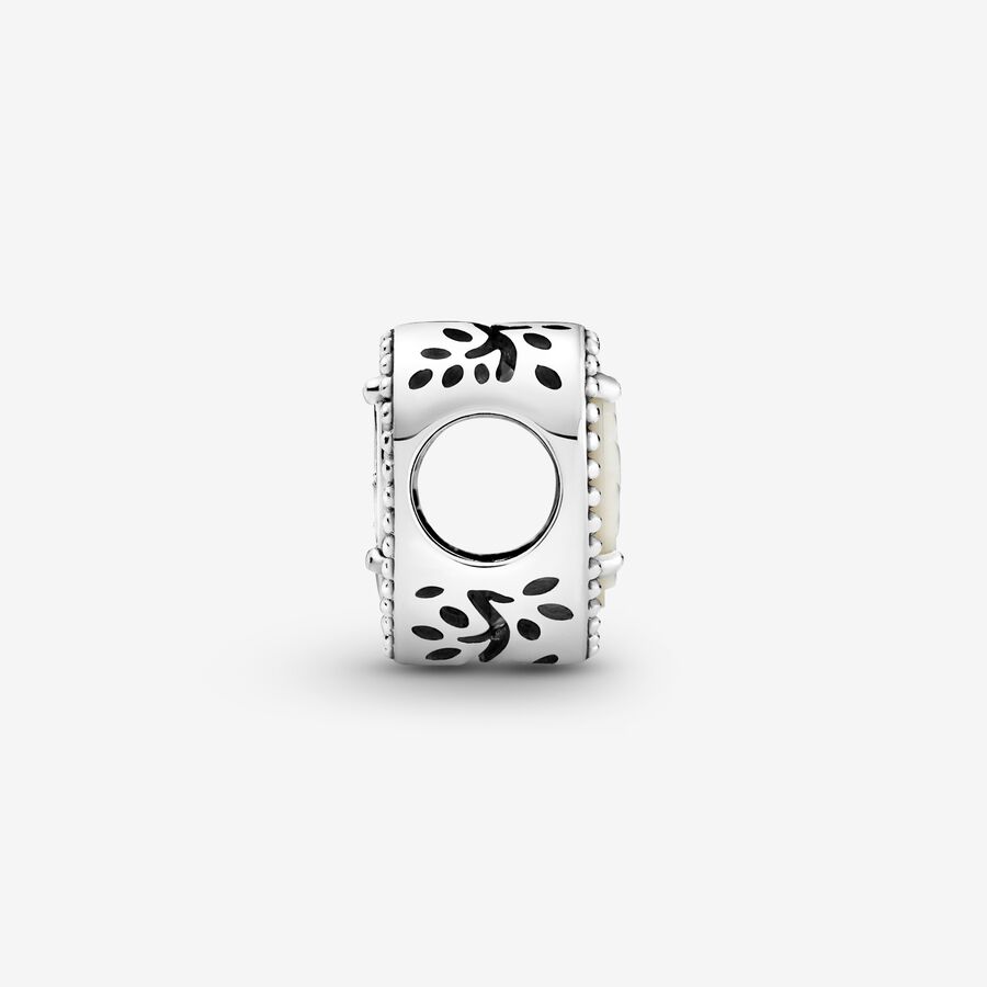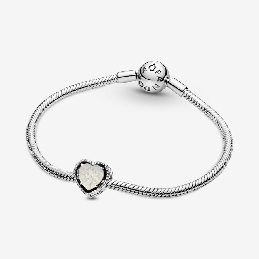 Delight your loved one with the Openwork Heart & Family Tree Charm. Hand-finished in sterling silver, this openwork design includes a heart-shaped mother of pearl disc with a raised family tree detail in the center, held in place by a beaded outline with four prongs. The engraving “Family forever and always” featured on the polished sterling silver reverse side. Cut-out branches and leaves decorate the sides of the charm. Gift to a family member as a symbol of your special bond.