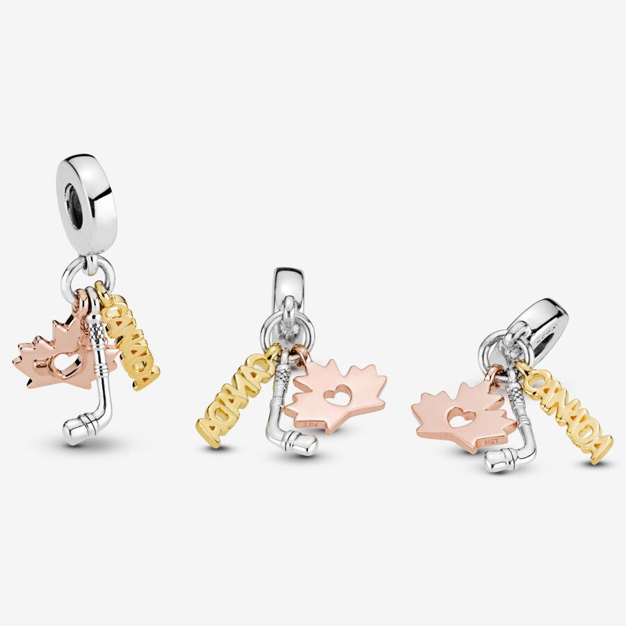Wear more of the things you love — and think of Canada every time you see this Canada, Maple Leaf & Hockey Stick Dangle Charm on your Pandora Moments bracelet. The tri-tone design is made from sterling silver, 14k rose gold plating and 14k gold plating. The pendant piece also works on a necklace chain.