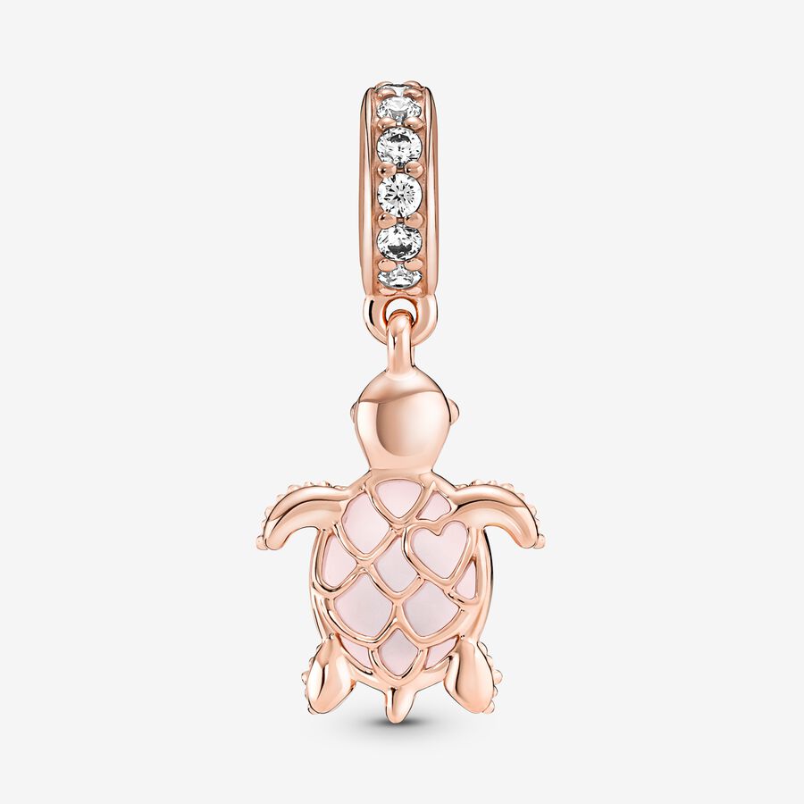 Our much-loved sea turtle charm is joined by a new friend in frosted pink and warm-toned metal. This 14k rose gold-plated dangle charm features clear cubic zirconia on the bail and a frosted Murano glass shell with unique shimmering flecks that catch the light. The belly of the sea turtle features a cutout pattern with an off-center heart to a create pretty scale-like effect. Carry more turtle friends on your Pandora Moments bracelet or charm holders.
