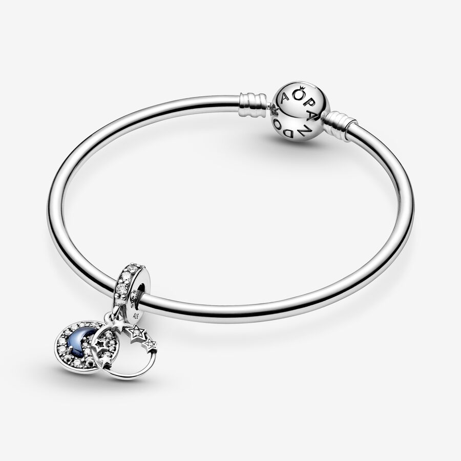 Prove your love knows no bounds with the Blue Night Sky Crescent Moon & Stars Dangle Charm. Hand-finished in sterling silver, the front dangle features an open circle decorated with stars that overlap the frame. The back disc includes a raised blue half-moon-shaped stone, which is a brand-new addition to Pandora jewellery, surrounded by clear stones with the engraving &ldquoI love you more than all the stars in the sky&rdquo on the reverse. Gift this moon and stars charm to someone special to show how much you care.