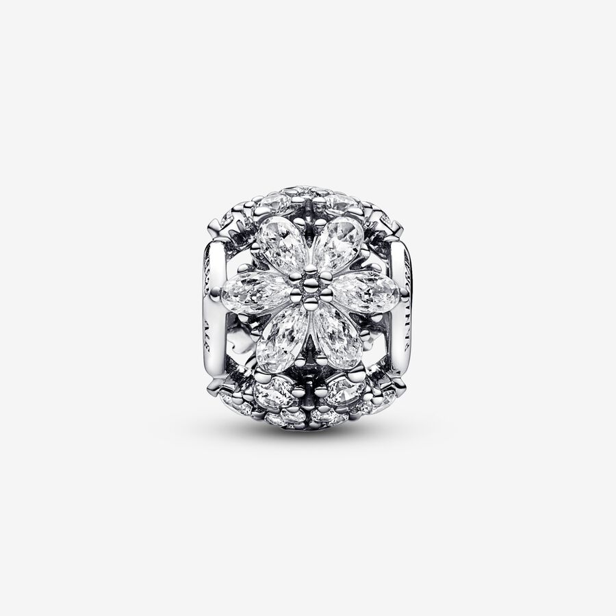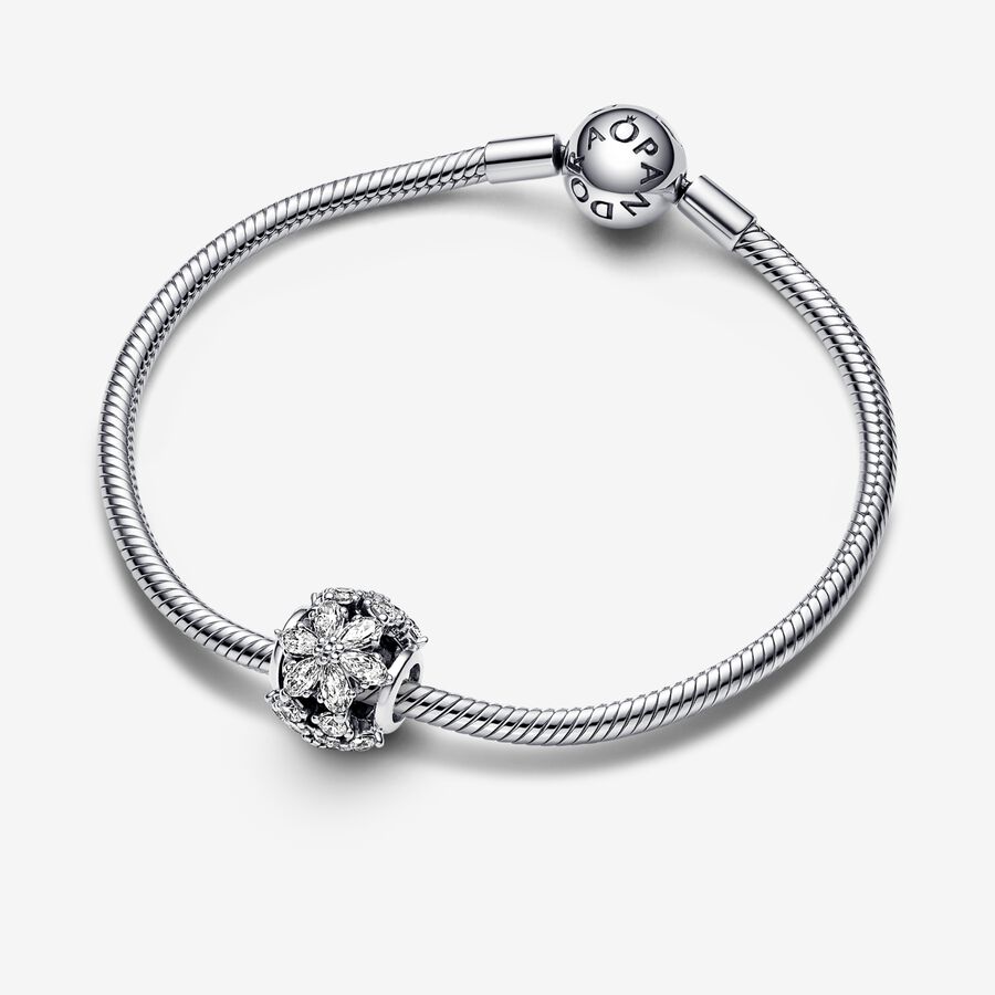 Bring the beauty of nature to your jewelry with the Sparkling Herbarium Cluster Round Charm. This sterling silver charm is composed of four clusters of clear cubic zirconia stones forming a spherical shape. The clusters alternate between two subtly different designs, composed of round or pear-shaped stones with a cluster of microbeads at the center. An elegant reinterpretation of how nature forms beautiful shapes with petal and leaf-inspired elements.