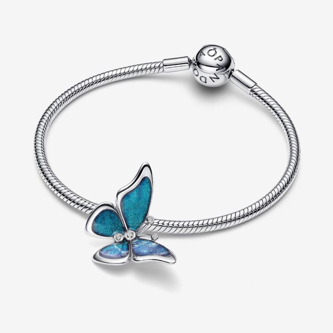 This oversized sterling silver charm captures the beauty and grace of a real butterfly, as if it has landed for a moment on your jewellery. Iridescent enamel on the wings creates a vivid colour effect that shifts with the light. Sparkling stones bring a finishing touch to the body and antennae. Wear this eye-catching piece as a symbol of the butterfly's transformative journey, inspiring us to embrace change and growth.