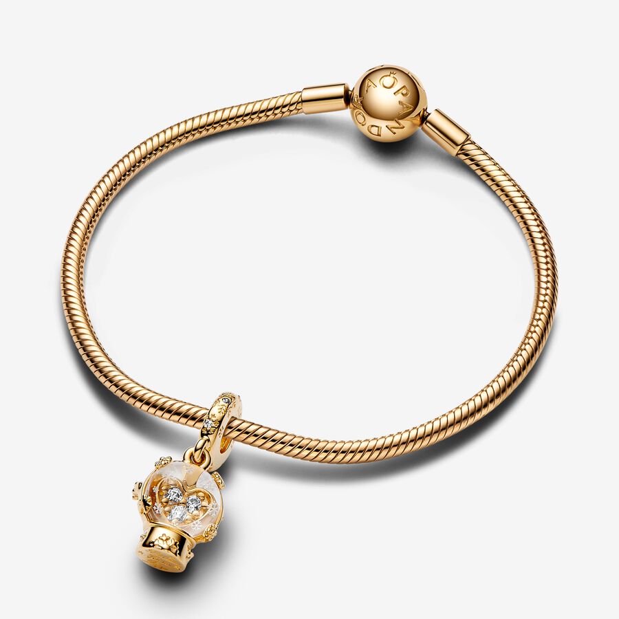 Embrace the nostalgia of festive days of old with the Heart Snowflake Snow Globe Dangle Charm. Plated in 14k gold, this Murano glass snow globe charm features engraved snowflakes that capture the beauty of a winter wonderland. The snow globe is inspired by our existing sterling silver snow globe charm with a new twist: it features a heart inside the Murano glass with three clear cubic zirconia stones. This special festive charm adds the perfect touch of sparkle to any look – just in time for the holidays.