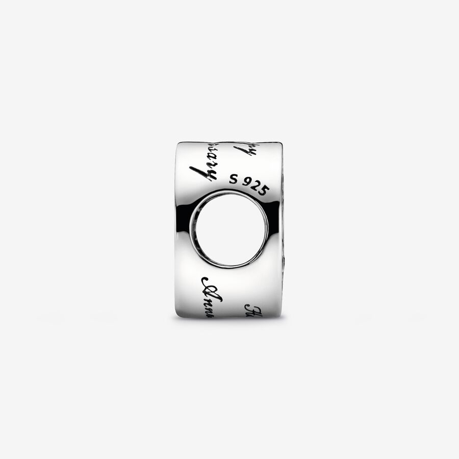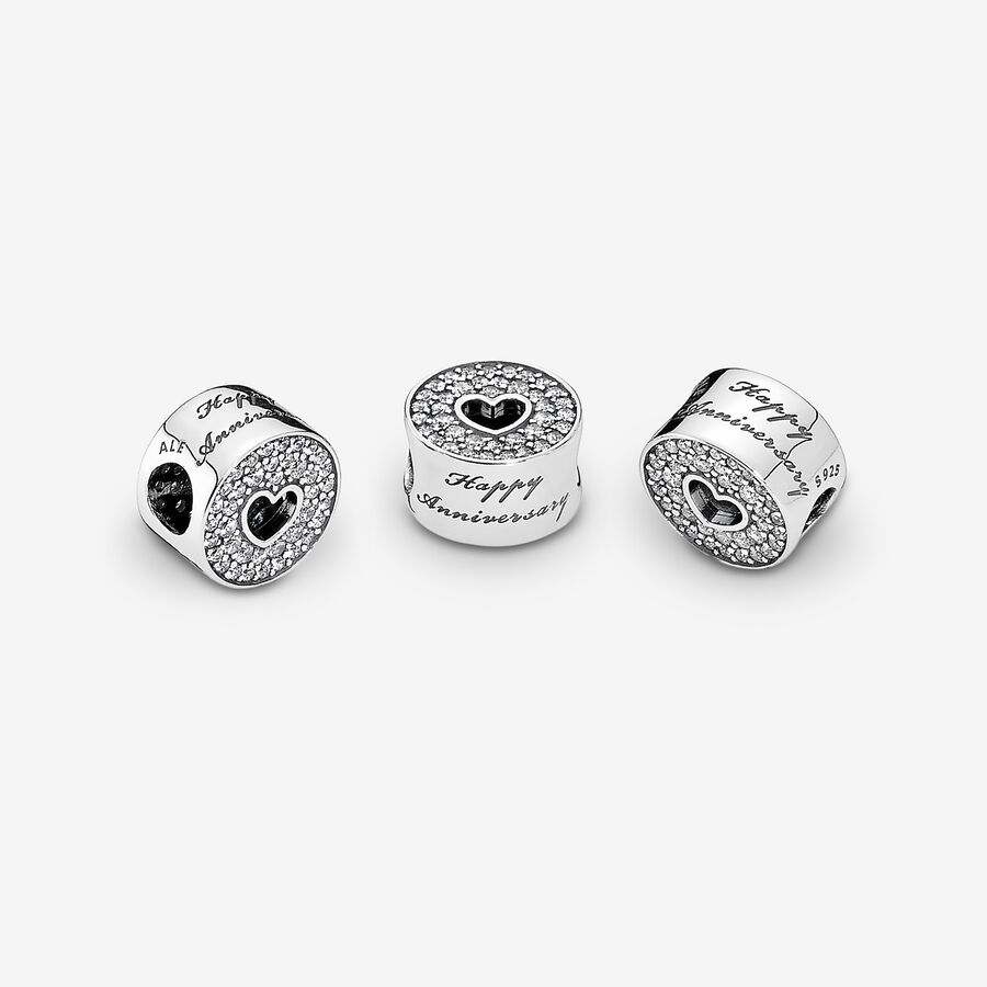 Celebrate an important anniversary with this sterling silver charm. The button-shaped piece is centered on each side with a cut-out heart surrounded by pavé cubic zirconia for a hint of sparkle. The timeless design looks equally beautiful on all Pandora Moments bracelets – and you can even string it on a necklace as a pendant. It’s engraved on the side with the words “Happy Anniversary,” making it an ideal gift to celebrate a milestone.