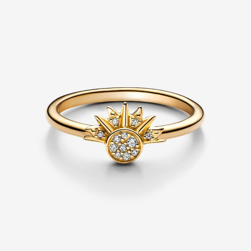 Radiate summer energy with the Celestial Sparkling Sun Ring. This hand-finished ring glows in 14k gold-plating, with a sun motif in the center formed by a circle of clear pavé with rays emanating from one side. Wear it by itself as a symbol of energy, positivity and life, or stack it with its counterpart, the Celestial Blue Sparkling Moon Ring. The two rings fit perfectly together, representing duality and harmony in nature and within ourselves.