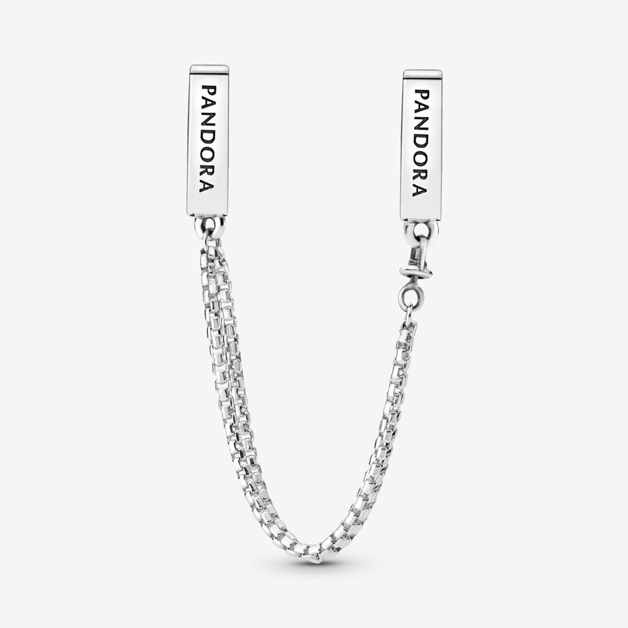 Add a new layer of style and make sure that your Pandora Reflexions™ bracelet never slips off with this sparkling safety chain clip charm. The beautiful draping chains and the exquisite detail on the clips places this safety chain in a league of its own. Set with 12 cubic zirconia, it features the Pandora logo on the back so that it can be flipped depending on your mood or desired expression.