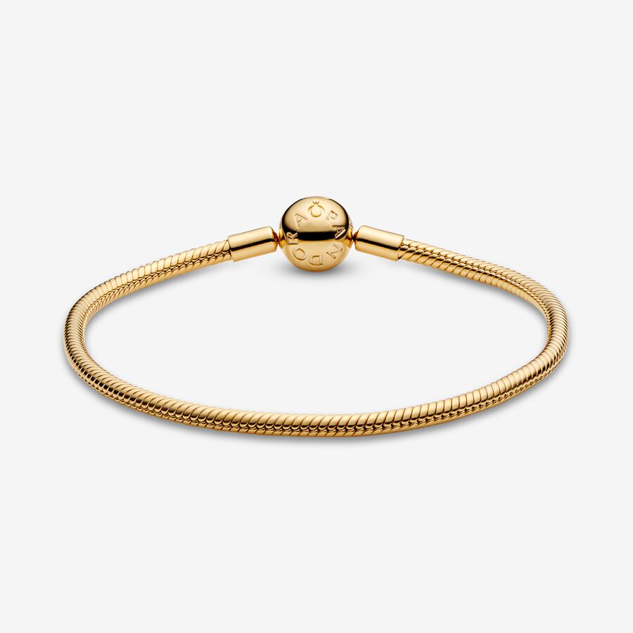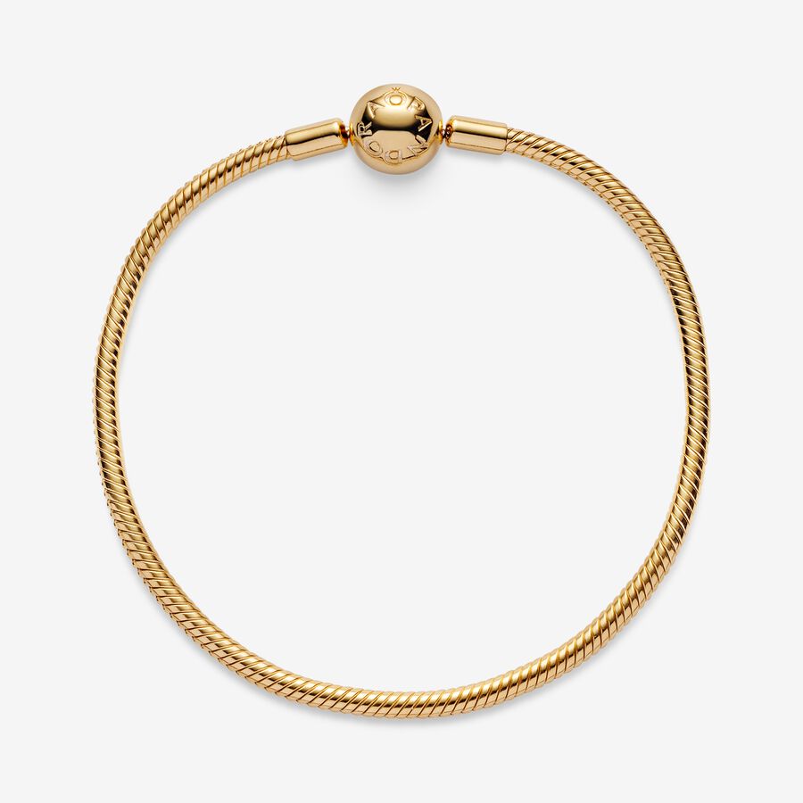 Start your very own Pandora story with this sleek 14k gold-plated Snake Chain Bracelet. The perfect canvas for your creativity, this hand-finished bracelet can be styled in countless ways. Fill it with your desired charms and clips, wear it on its own for a simple, understated look, or stack it with contrasting bracelets for a fun play on textures.