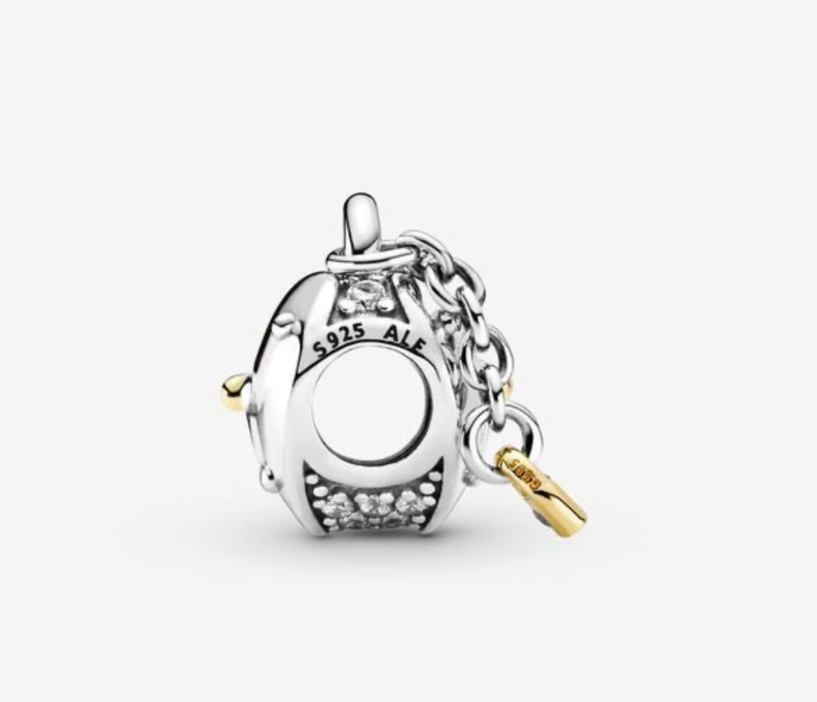 Wear a reminder of those you hold close with the Two-Tone Heart and Lock Charm. Hand-finished in sterling silver and 14k gold, the heart-shaped design includes a padlock and slightly raised keyhole with 14k gold detailing at the top. Beading features on the front and back to represent nails, with clear stones decorating the top of the charm. The small 14k gold padlock dangles from a chain. Style with other heart-shaped charms on your carrier for a look filled with love.
